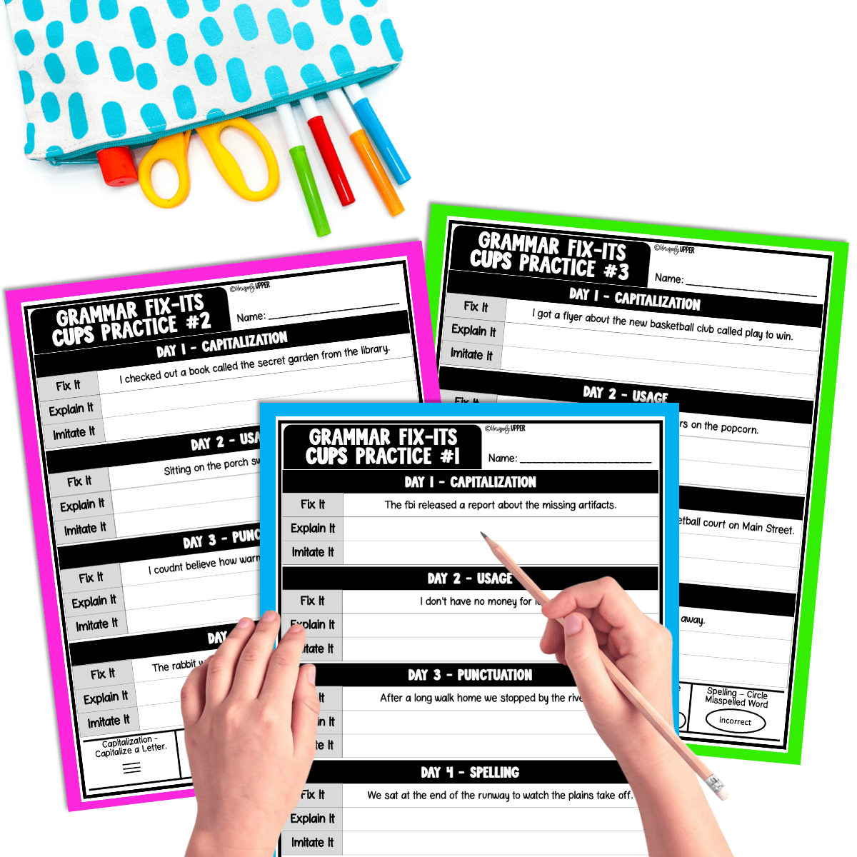 First, you have your students fix one intentional error. This might be a sentence on the board or a short paragraph on paper. Then, your students will mark the mistake and correct it. They’re not fixing everything, just one thing, which keeps the task focused.